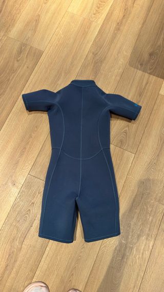 Traje de neopreno corto para niñ@s, talla 10-11. Cierre frontal con cremallera. - Material: Neopreno. - Color: azul oscuro con cremallera rosa. - Diseño: Manga corta y pernera corta.