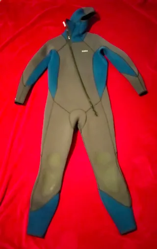 Traje de neopreno completo con capucha, ideal para actividades acuáticas. - Talla 10 años (135-145 cm) - Diseño en color negro y azul. - Cierre frontal con cremallera. - Refuerzos en rodillas.