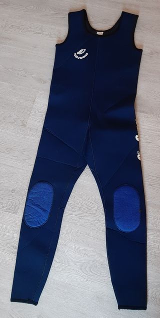 Traje de neopreno de hombre para snorkel, buceo. Usado en tres ocasiones. Muy buen estado. Talla 2/S, espesor 5,5 mm, negro y gris, dos piezas. Corte anatómico y preformado. Rodillas y busto reforzados. Chaqueta con capucha, pantalón con tirantes. Sin costuras en articulaciones.