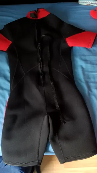 Traje de neopreno corto para niño/a de 10 años. Ideal para deportes acuáticos. - Color negro y rojo. - Cremallera trasera con tirador largo. - Mangas cortas y perneras cortas.