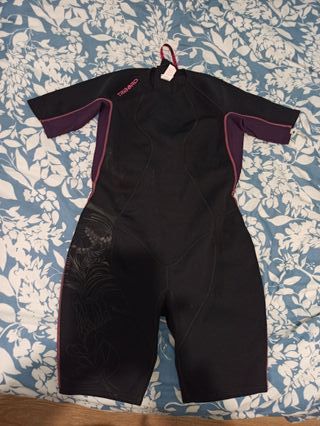 Traje de neopreno corto para niños de la marca OLAIAN, comprado en Decathlon. Tejido ligero con aislamiento térmico para piscinas cubiertas, clases de natación y para usar en el mar, disfrutando del agua sin pasar frío. - Talla 6 años - Usado solo 2 o 3 veces - Color morado con detalles en rosa - Mangas cortas - Piernas hasta la rodilla - Cremallera en la espalda con tirador - Se seca con rapidez