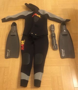 Traje de neopreno de 2 piezas, ideal para pesca submarina. Está en buen estado y listo para usar. - Incluye traje completo de 2 piezas, invierno y verano talla 56 - XXL - aletas Cressi Sub Pro 2. talla 46-47 - Cinturon de plomadas - precio no negociable