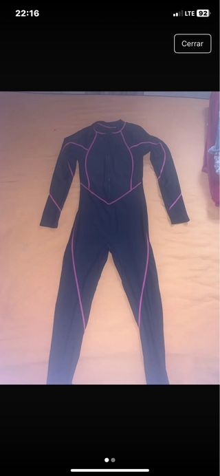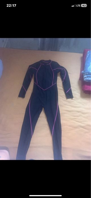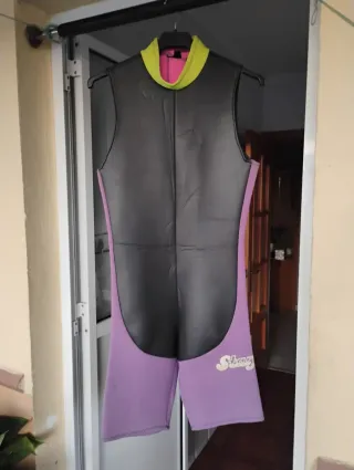 Traje de neopreno semiseco, en color morado y negro. Está en buen estado. - Talla: mediana - Marca: (Añadir marca) - Material: Neopreno