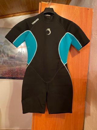 Traje de neopreno corto de la marca Tribord, ideal para actividades acuáticas. - Color negro con detalles en azul turquesa. - Mangas cortas. - Piernas cortas. - Cuello redondo.