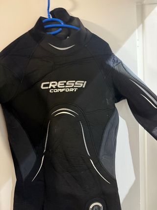 Traje de buceo Cressi Comfort de 7mm, talla L. Se vende SOLO el Traje de neopreno con bolsillo lateral y cremalleras perfectas, y capucha usado en contadas ocasiones. - Neopreno flexible para mayor comodidad. - Refuerzos en rodillas y codos. - Incluye capucha. - No se venden escarpines ni aletas solo traje y capucha