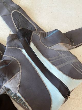 Traje de neopreno con diseño en dos tonos. - Mangas y parte superior en azul. - Piernas y torso en negro. - Cierre con cremallera.