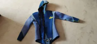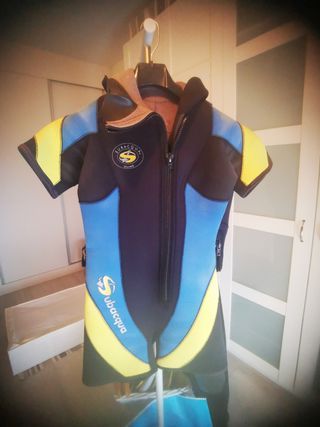 Traje de neopreno mujer corto Subacua Diving de 5 mm con capucha. - En perfectas condiciones. - Solo 2 usos. - Cremallera perfecta - Diseño en color negro, azul y blanco. - Cremallera frontal. - Mangas cortas y perneras cortas.