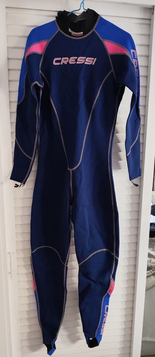 Traje de neopreno Cressi para mujer, en muy buen estado, solo usado un par de veces. Talla M. - Color azul marino con detalles en rosa, azul y gris. - Cremallera en el cuello. - Diseño de manga larga y pantalón largo.