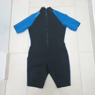 Traje de neopreno corto, ideal para deportes acuáticos. Diseñado con paneles de diferentes colores para un estilo moderno. - Color principal: azul. - Paneles laterales y en las piernas: negro. - Mangas cortas. - Cuello redondo.