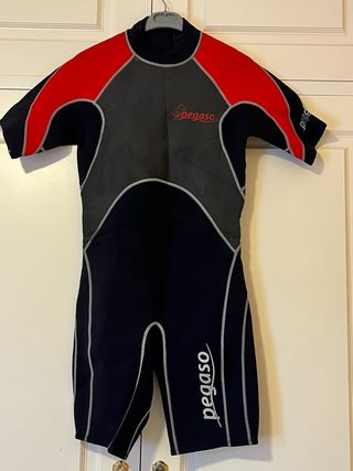 Traje de neopreno corto con mangas y perneras. - Color principal azul marino. - Detalles en rojo y gris. - Logo de la marca Pegaso en pecho y pierna.