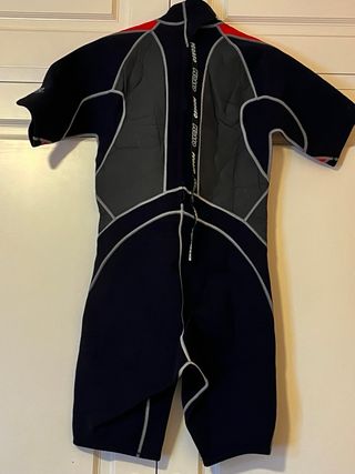 Traje de neopreno corto tipo shorty para niños, ideal para aguas cálidas y piscinas. Usado 2 veces para clases de natación. - Talla: 8 años, 131 cm - Color azul marino y azul. - Cremallera trasera para facilitar la puesta. - Mangas cortas. - Costuras reforzadas.