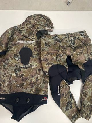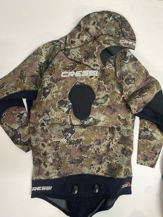 Traje de neopreno Cressi semiseco de 3,5mm. Compuesto por chaqueta con capucha y pantalón. - Diseño de camuflaje. - Traje en dos piezas - Rodilleras y coderas reforzadas.