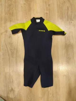 Traje de neopreno para niño de la marca Olaian. Está en buen estado y es ideal para actividades acuáticas. - Marca: Olaian - Talla: (Especificar talla) - Color: Azul marino y amarillo