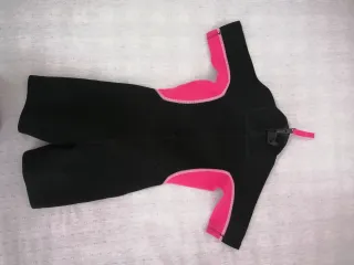 Traje de neopreno corto para niños, negro y rosa. Mi hija lo ha estado utilizando desde los 3, hasta los 5 años. No se el tallaje exacto porque le quite la etiqueta. Cremallera trasera y velcro. En buen estado. Solo se ha utilizado para clases de natación.