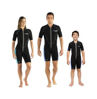Traje de neopreno para niño, ideal para actividades acuáticas. Diseñado para ofrecer comodidad y protección. - Color azul y negro. - Manga corta y pernera corta. - Cierre de cremallera frontal. - Costuras en contraste.