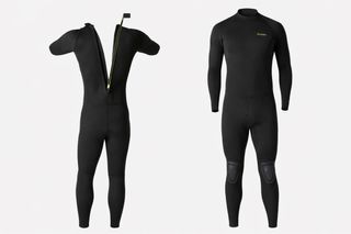 Traje de neopreno de la talla M. - Diseño con paneles en azul y negro. - Cremallera frontal. - Costuras visibles en color dorado.