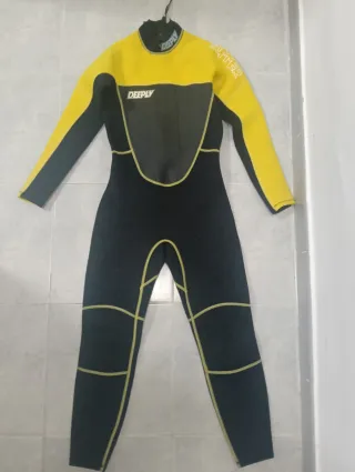 Traje de neopreno largo, apto para uso unisex. - Color negro y amarillo. - Talla 14. Me parece que tiene 2 o 3 mm pero no estoy segura