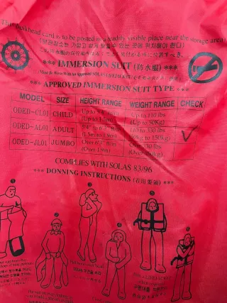 Traje de inmersión profesional de la marca ODED (Modelo AL01), diseñado para supervivencia en alta mar. Fabricado en neopreno de alta visibilidad con bandas reflectantes. Cumple con la normativa internacional SOLAS 83/96. • Estado: Excelente / Como nuevo (revisar cremallera y sellados). • Talla: Adulto (Adult). • Rango de altura: 1.50m a 1.90m. • Rango de peso: 50kg a 150kg. • Características: Incluye guantes integrados, capucha de protección térmica, cremallera estanca frontal y bolsa de transporte original con instrucciones de uso. • Uso: Ideal para embarcaciones de recreo, profesionales del mar o coleccionismo de equipo náutico.