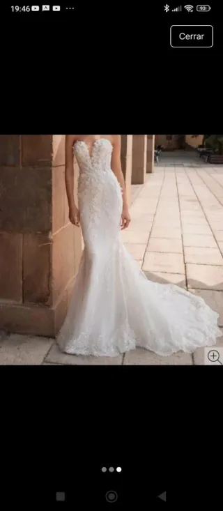 Vestido de novia Ortiva de Pronovias, línea White One, talla 40 (sin arreglos). Está sin estrenar. Está confeccionado entero en chantillí, con corte sirena y escote en la espalda. Es súper cómodo y no pesa nada ni se enreda.