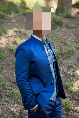 Traje de novio, talla 48, color azul. Se compone de chaqueta, chaleco y pantalón, regalo tirantes si le interesa al comprador.