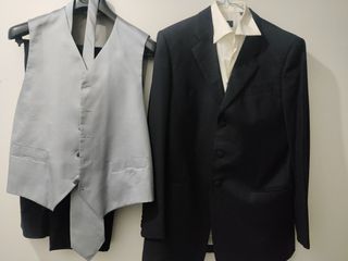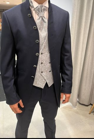 En perfecto estado lo vendo por ya no usar. Me costó 1400 euros. Americana de Armani Un regalo funda de viaje ( sin cremallera) pero conserva el traje perfectamente. Los conjuntos está compuesto por pantalones chaqueta camisa con ojlales en las mangas,chaleco y corbata.