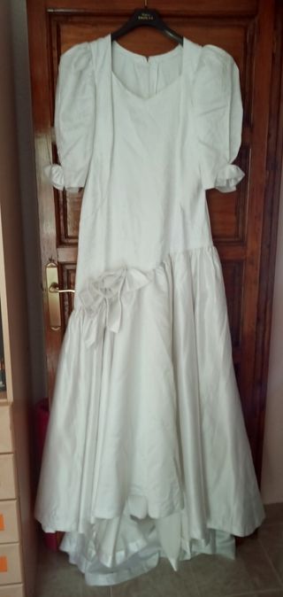 Traje de novia blanco de los 80, tela de raso, cuerpo raso adamascado. Lleva doble falda , la de dentro va con una entretela suave, la parte de atrás lleva un poco de cola. Hecho a medida en Isamar novias. En los bajos hay un par de quemaduras. Largo delantero desde los hombros 1.50cm, largo trasero desde el escote 2m, de Sisa a Sisa 48cm y de hombro a hombro 36cm. La talla exacta no la se 46 o 48.