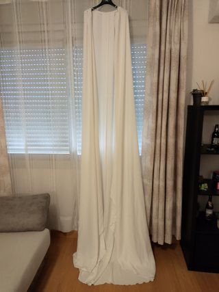 Semicola novia blanca de unos 2,5m aproximadamente. Utilizada una única vez, lavada. Parte de la cintura y se quita y pone muy fácilmente con unos enganches que están ocultos. Tiene un agarre para la muñeca para poder llevarla recogida. Tela muy suave, no se arruga mucho, ligera y cómoda. El precio fue de 450€. Se vende con la funda original.
