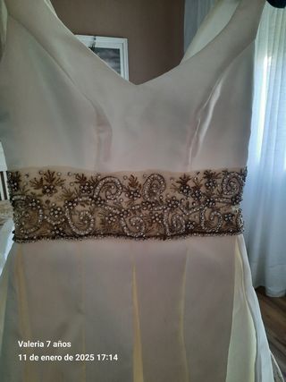 Traje en perfecto estado, lavado en tintorería y con fajín de pedrería y larga cola. Comprado en tiendas de novia Manila, Sevilla.