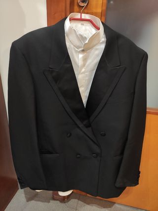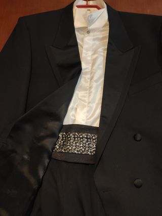 bonito traje de novio en negro y morado el pantalón es negro brillante como la solapa y el filo de los bolsillos de la chaqueta el pantalón marca ,talla 44. la chaqueta pone talla 52 es cortita. en la fotografía se aprecia el dibujito que tiene la chaqueta pongo también la camisa de regalo de Carlos Córdoba talla 41.