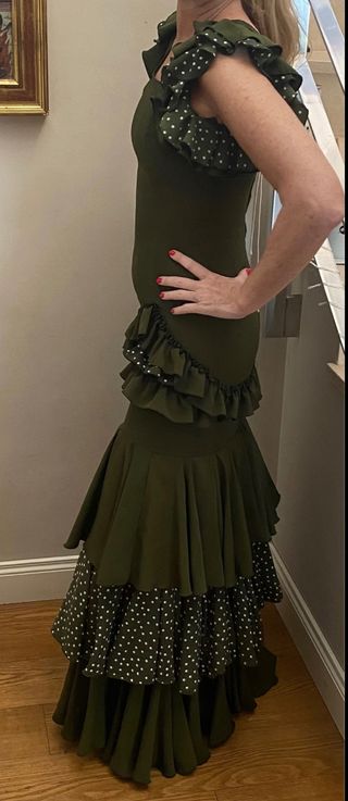 Vestido de flamenca para la feria en verde oscuro,l con lunares blancos en los volantes. Talla P, es como para una 38z se lava y seca muy rápido, no necesita planchado. Lleva un bolsillo por dentro