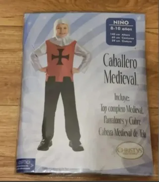 Disfraz de caballero medieval para niño, ideal para fiestas temáticas o Halloween. Incluye todo lo necesario para una transformación completa. - Talla M (8-10 años). - Incluye top, pantalones y cubre cabeza de tela. - Diseño con cruz templaria.