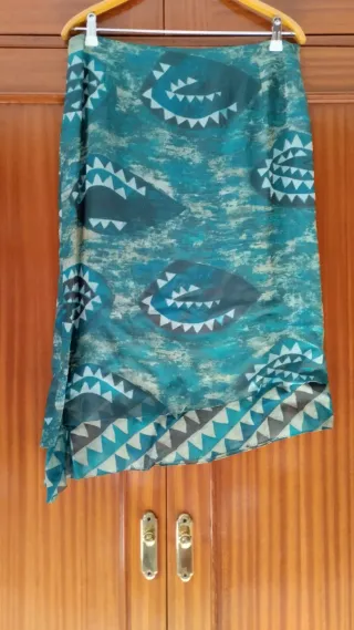 Traje de flamenca en tejido de georgette con un diseño de volantes en cascada. La parte superior es de color verde agua y la falda presenta una combinación de volantes en verde agua, amarillo y rosa. Aunque marca la 42 se asemeja más a una 40. Medidas: 140 largo, 88 de pecho, 60 cintura y 102 de cadera. Perfecto estado