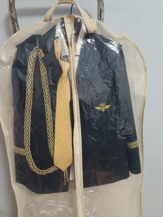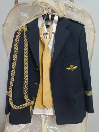 Traje de comunión completo en tonos azul marino y dorado. - Chaqueta azul marino con detalles dorados. - Corbata y chaleco a juego en color dorado. - Camisa blanca. - Galones dorados en hombros y puños. - Escudo bordado en dorado en la solapa.