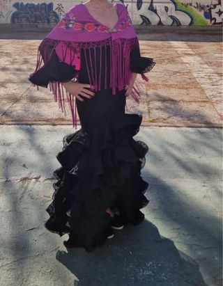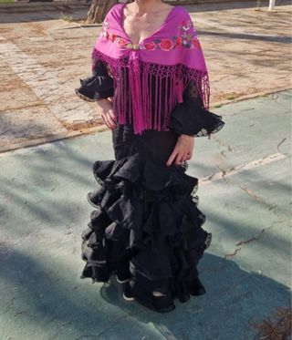 Traje de flamenca con un diseño vibrante y llamativo. - Tela con licra que se adapta y ajusta al cuerpo. - No pesa nada, es muy cómodo de llevar. - Detalle de bordados florales en el mantón. - Falda con volantes escalonados. - Si lo prefieres, también tengo el mantoncillo en negro con el bordado en negro.
