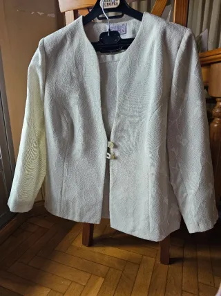 Elegante conjunto de vestido y chaqueta. - Diseño con bordados florales. - Chaqueta corta blanca. - Vestido a juego con cinturón. La talla corresponde con una 46.