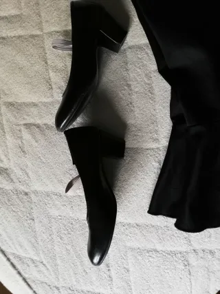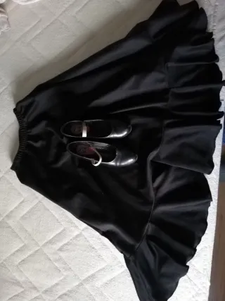 Conjunto de falda y tacones negros para niña, ideal para clases o actuaciones de flamenco. - Falda con vuelo. - Tacones con tira elástica para mayor sujeción.