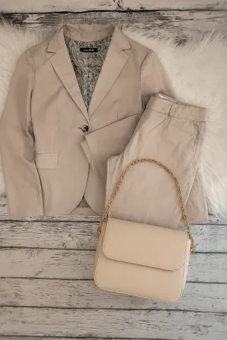 Precioso traje de blazer y pantalón en color beige. Talla 38 de Massimo Dutti. 🤎 El traje está en perfecto estado, no tiene rotos, manchas ni enganches de ningún tipo. ✅✅ Blazer entallada, sienta estupendamente 🤎 Todas las medidas están en las fotos 📷 Por favor comprobar bien antes de comprar! 📏 *Bolso no incluído ✖️ HAGO ENVÍOS 🚚