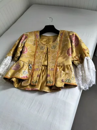 Traje tradicional de Fallera en tonos dorados y amarillos. Un diseño elegante y detallado. - Tejido con bordados florales. - Adornos dorados. - Escote adornado con pedrería.