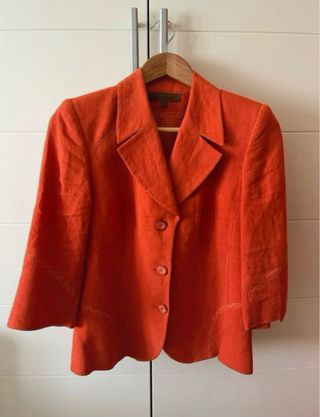 Sin estrenar. Elegante traje de dos piezas en color naranja, perfecto para ocasiones especiales o para el día a día. - Chaqueta con cuello solapa y cierre de botones. - Pantalón de corte recto.