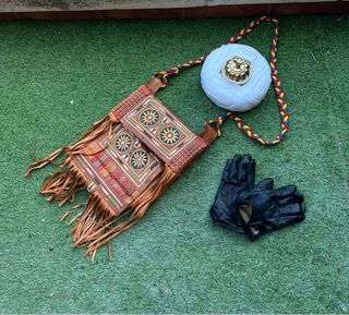 Capucha - Cinturón de cuero con detalle de cruz roja. - Dos brazaletes de cuero con tachuelas y cruz. - Bolso de cuero con diseño tonos. botas 30-32. No negociable, se vende todo junto
