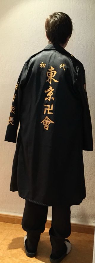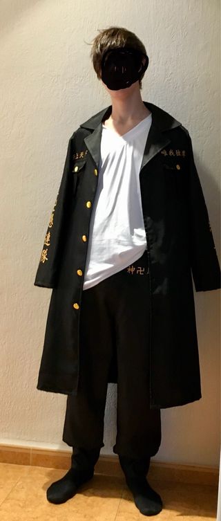 Disfraz inspirado en el anime Tokyo Revengers. - Chaqueta negra con detalles dorados. - Pantalones negros. - Camiseta blanca. - Botas negras.