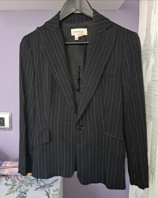 Elegante blazer de Zara con un diseño clásico de rayas verticales. - Color negro con finas rayas blancas. - Cuello solapa. - Cierre de un botón. - Bolsillos frontales.