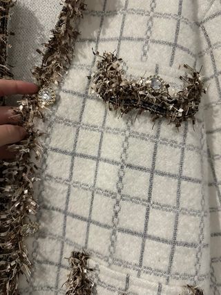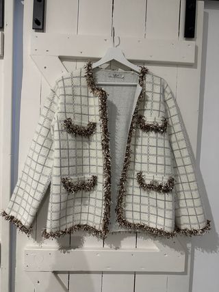 Chaqueta de punto con un diseño de cuadros elegante y moderno. Perfecta para añadir un toque sofisticado a tu atuendo. - Acabado con detalles de flecos en los bordes y bolsillos. - Tejido suave y cómodo.