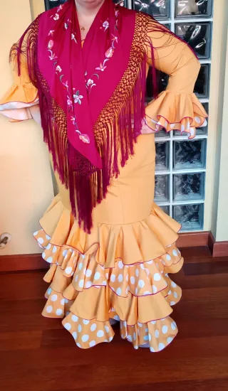 Vestido de flamenca de la diseñadora Sevillana Natalia Ferrer. Color albero con detalles en buganvilla y lunares. Puesto dos veces hace años. Tiene algunas manchas amarillas por dentro de estar guardado tanto tiempo. Y una pequeña mancha en la parte de la cadera muy pequeña como se ve en la ultima foto. 4 volantes, con mucho vuelo. No lleva bolsillo. Dos volantes en las mangas. Medidas: Pecho 61 Cintura54 Cadera 64 Largo 148 Talla más o menos 54 Me costó 480€. De diseñadora sevillana hecho a medida. Precio muy poco negociable. - Escote en V. Precio no negociable MANTÓN NO INCLUIDO