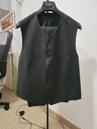 Traje de chaqueta para hombre. - Chaqueta de corte clásico. Talla 54 Pantalón talla 46 Chaleco 54 - Color gris oscuro. - Cierre de botones. - Bolsillos frontales.