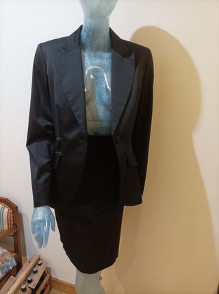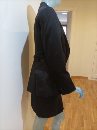 Conjunto de dos piezas para mujer, talla 36 de Zara, el pantalón es recto, la chaqueta, lleva una bronda en el puño, bolsillos falsos y un solo boton, forrada por dentro y lleva hombreras incorporadas pero que se pueden quitar. La tela tiene mucha caida, no se arruga fácilmente. Tiene una boda. En perfecto estado.