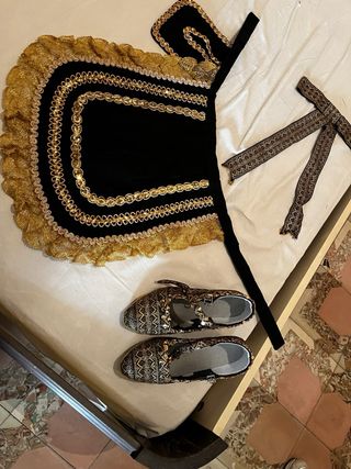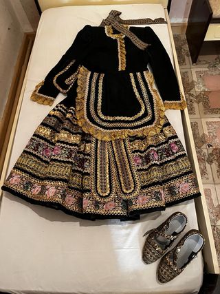 Este es un espectacular traje tradicional de la región de Toledo, con una confección artesanal de gran calidad. Está compuesto por: Chaquetilla de manga larga en negro con detalles dorados y encaje. Falda amplia con bordados florales en tonos rosa y verde, realzados con pasamanería dorada. Mandil bordado con diseño geométrico y ribete dorado. Pañuelo a juego, para completar el atuendo tradicional. Zapatos bordados a mano, con hebilla ajustable.