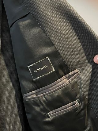 Traje de chaqueta para chico de la marca Zara. - Chaqueta de corte clásico talla 52. - Dos botones frontales. - Bolsillos de solapa en la parte delantera. - Pantalón talla 46. - Solo se ha usado en una ocasión y se ha llevado al tinte.