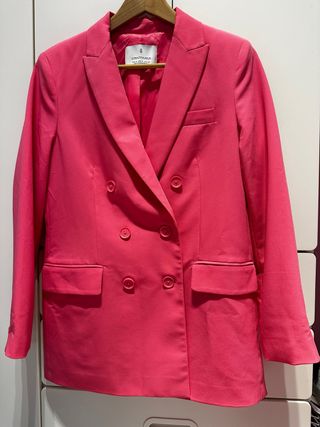Elegante blazer de Stradivarius en un llamativo color rosa. - Diseño de doble botonadura. - Dos bolsillos frontales con solapa. - Cuello de solapa clásico. Perfecto estado