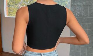 Chaleco elegante de corte recto, ideal para combinar con trajes o looks casuales. - Diseño sin mangas. - Cuello en V. - Cierre de botones. - Largo cropped. Talla 34 XS